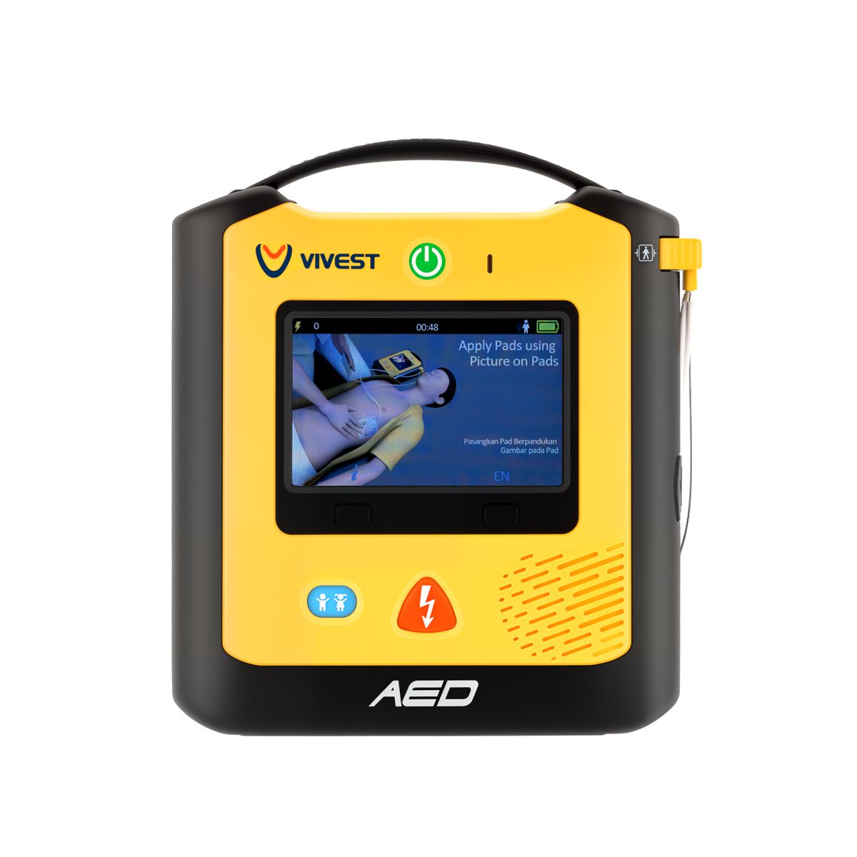 Defibrylator półautomatyczny Vivest PowerBeat X3 z kolorowym ekranem LCD, oferujący wizualne i głosowe instrukcje w czasie rzeczywistym. Urządzenie wspiera ratowników w prowadzeniu skutecznej resuscytacji krążeniowo-oddechowej, zgodnie z wytycznymi AHA 2020.